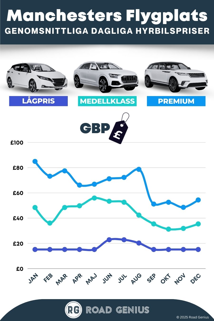 Med Road Genius är det enkelt att hitta bra erbjudanden på hyrbil från Manchester Airport (MAN). Jämför priser och boka allt på ett och samma ställe. Du hämtar bilen antingen vid diskarna i terminalerna eller i Car Rental Village, dit du kommer med en kostnadsfri skyttelbuss som avgår var tionde minut. Många hyrbilsbolag har öppet dygnet runt. Från flygplatsen tar du dig ut på motorväg M56 på bara några minuter för en smidig resa till Manchesters centrum, Liverpool, Peak District och andra destinationer.