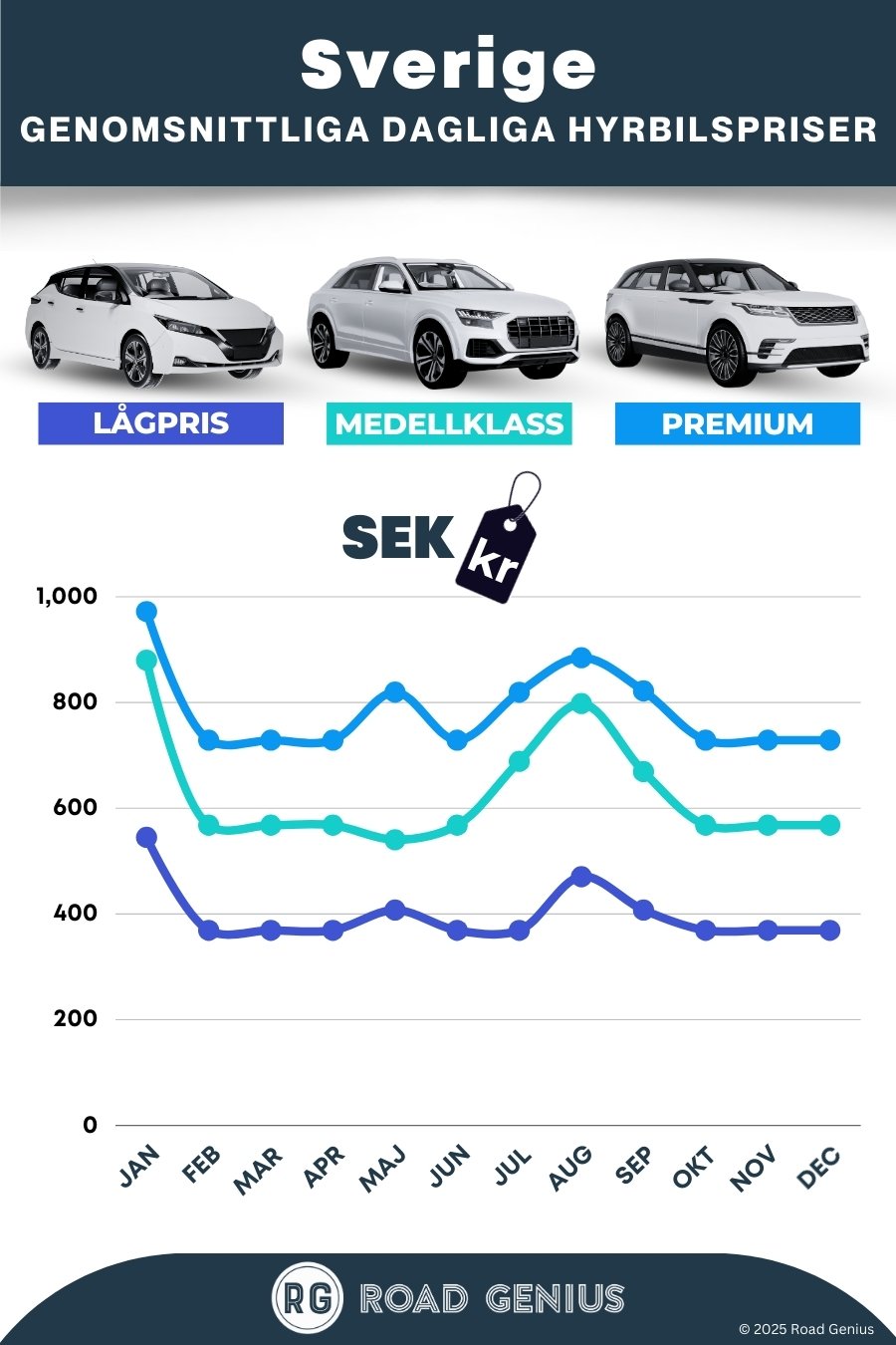 Hitta billigare hyrbilar i Sverige med Road Genius. Jämför aktuella priser på SUV:ar, kompaktbilar och minibussar och boka helt utan bokningsavgifter. Sök på stora flygplatser som Stockholm Arlanda och Göteborg Landvetter eller i städer som Malmö. Ofta är det billigare att hämta bilen på ett kontor i centrum. De flesta bolag erbjuder envägshyra inom Sverige, och vinterdäck ingår under vintersäsongen.