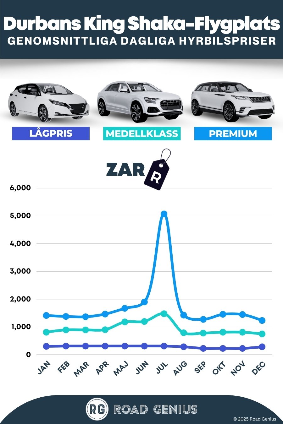 I genomsnitt kostar en bilhyra på King Shaka-flygplatsen i Durban cirka ZAR 997 per dag, med de billigaste alternativen från ZAR 230 per dag.