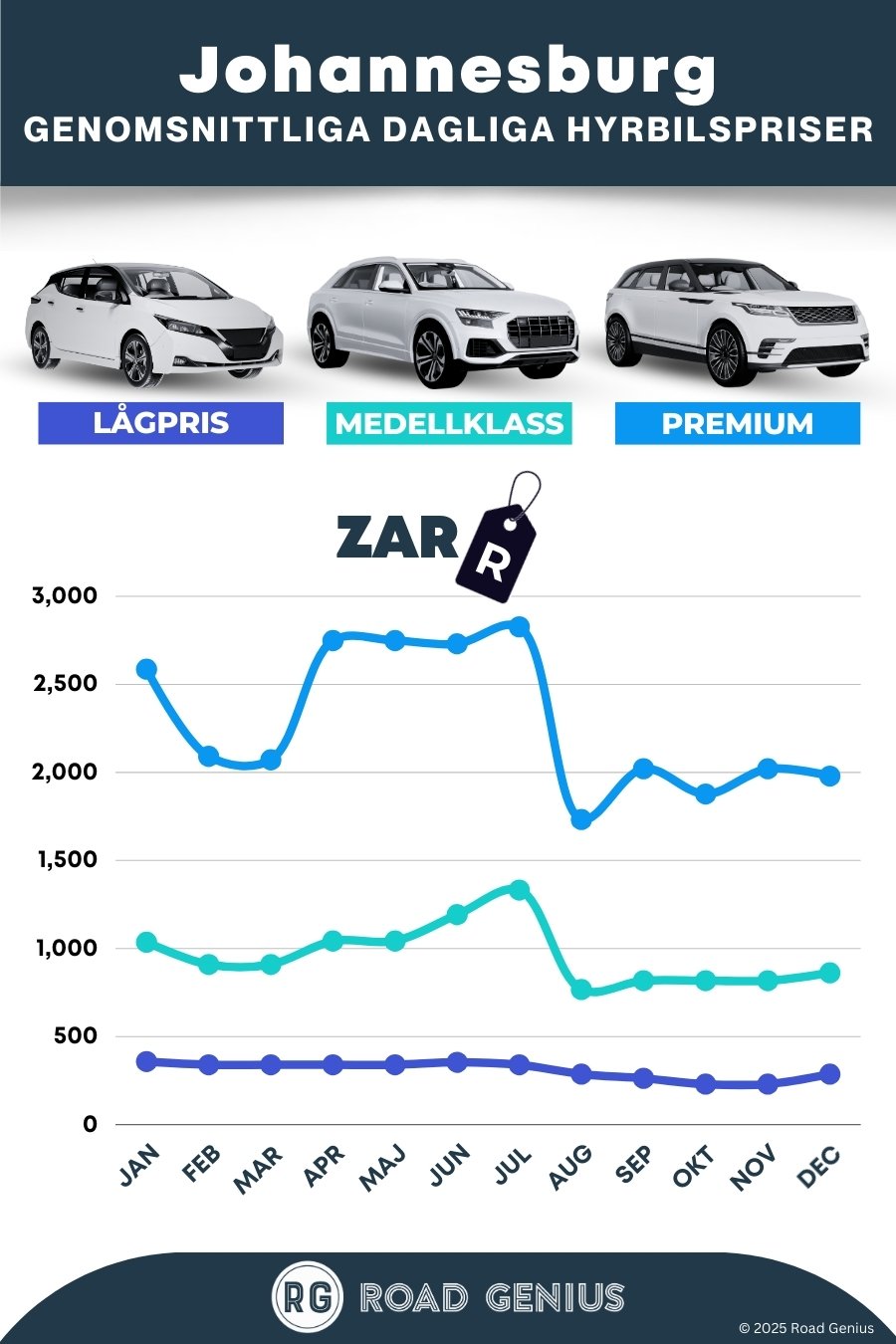 I genomsnitt kostar en bilhyra i Johannesburg cirka ZAR 1 186 per dag, med de billigaste alternativen från ZAR 230 per dag.