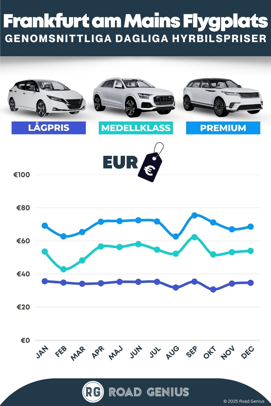 I genomsnitt kostar en bilhyra på Frankfurt am Main-flygplatsen omkring 52 € per dag, med de billigaste priserna från 31 € per dag.
