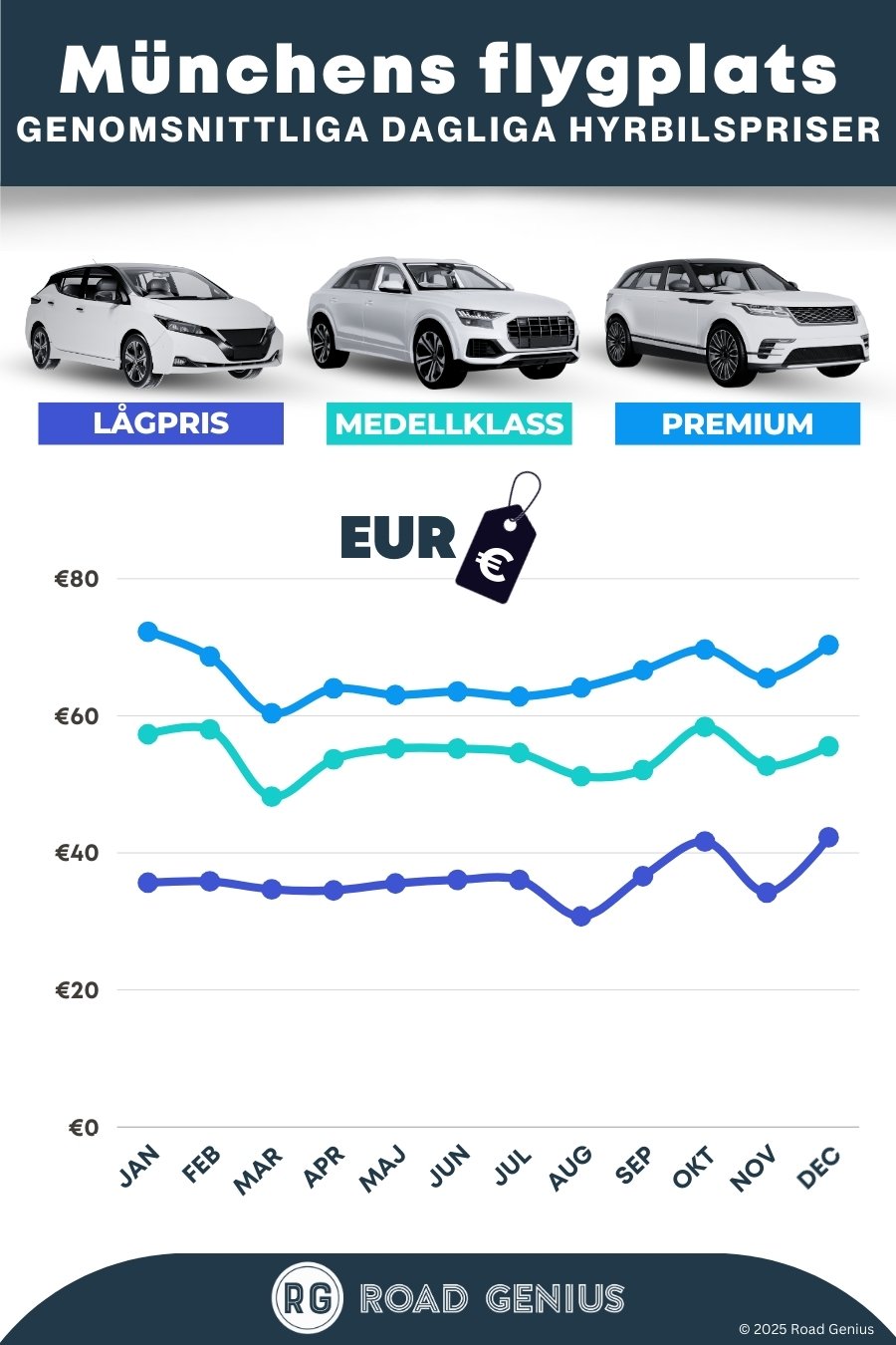 Hitta lägre priser på hyrbil på Münchens flygplats (Franz Josef Strauß International Airport, MUC) med Road Genius. Jämför priser på stadsjeepar, kompaktbilar och minibussar och boka utan bokningsavgift. Alla stora hyrbilsbolag finns samlade i det centrala biluthyrningscentret mellan Terminal 1 och 2, med smidig upphämtning i garage P26. Kör ut på A92 för snabba förbindelser till München, Salzburg eller Alperna, och filtrera på automat, vinterdäck, barnstolar och envägshyra.
