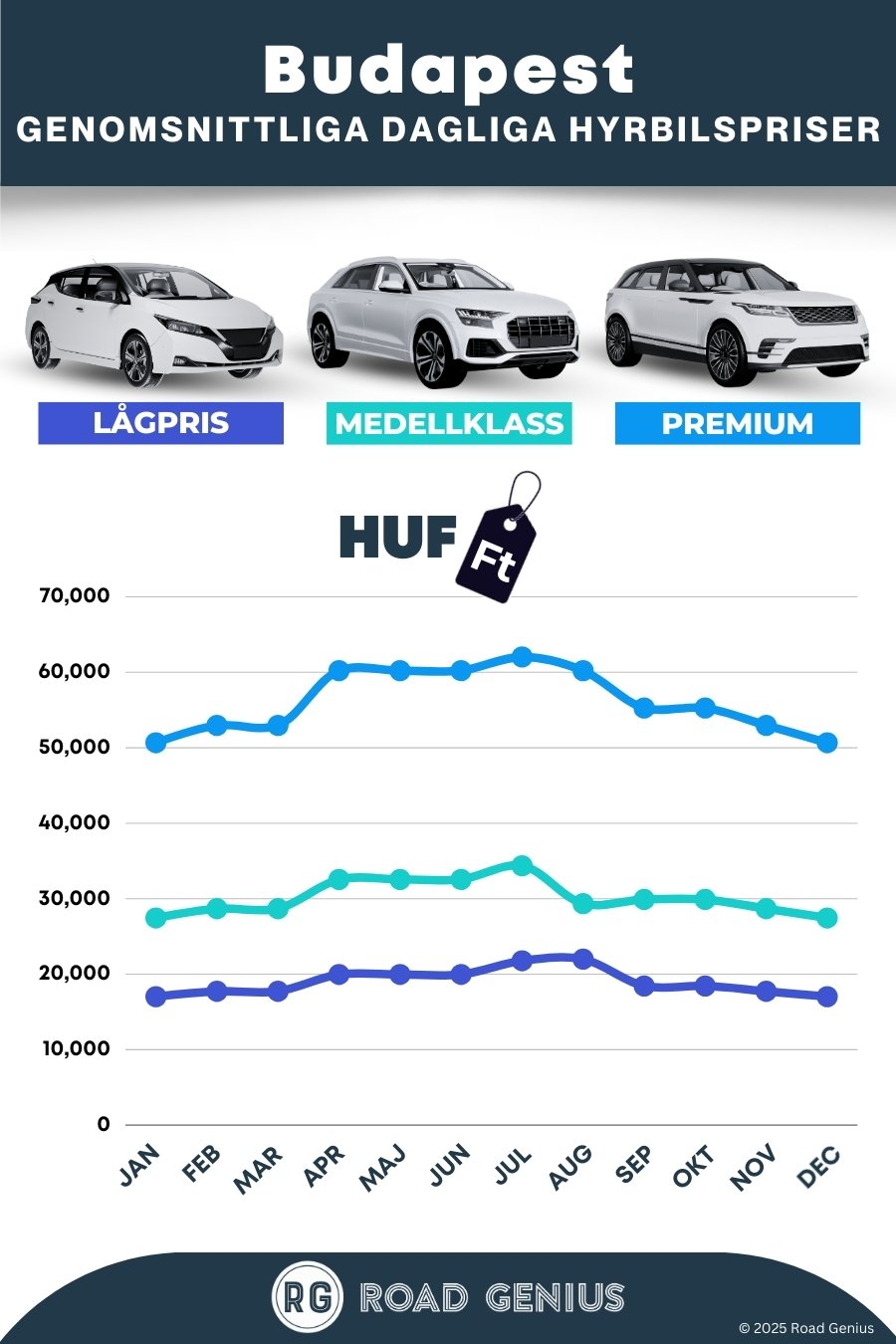 I genomsnitt kostar en bilhyra i Budapest omkring 35 103 HUF per dag, med de billigaste priserna från 17 023 HUF per dag.