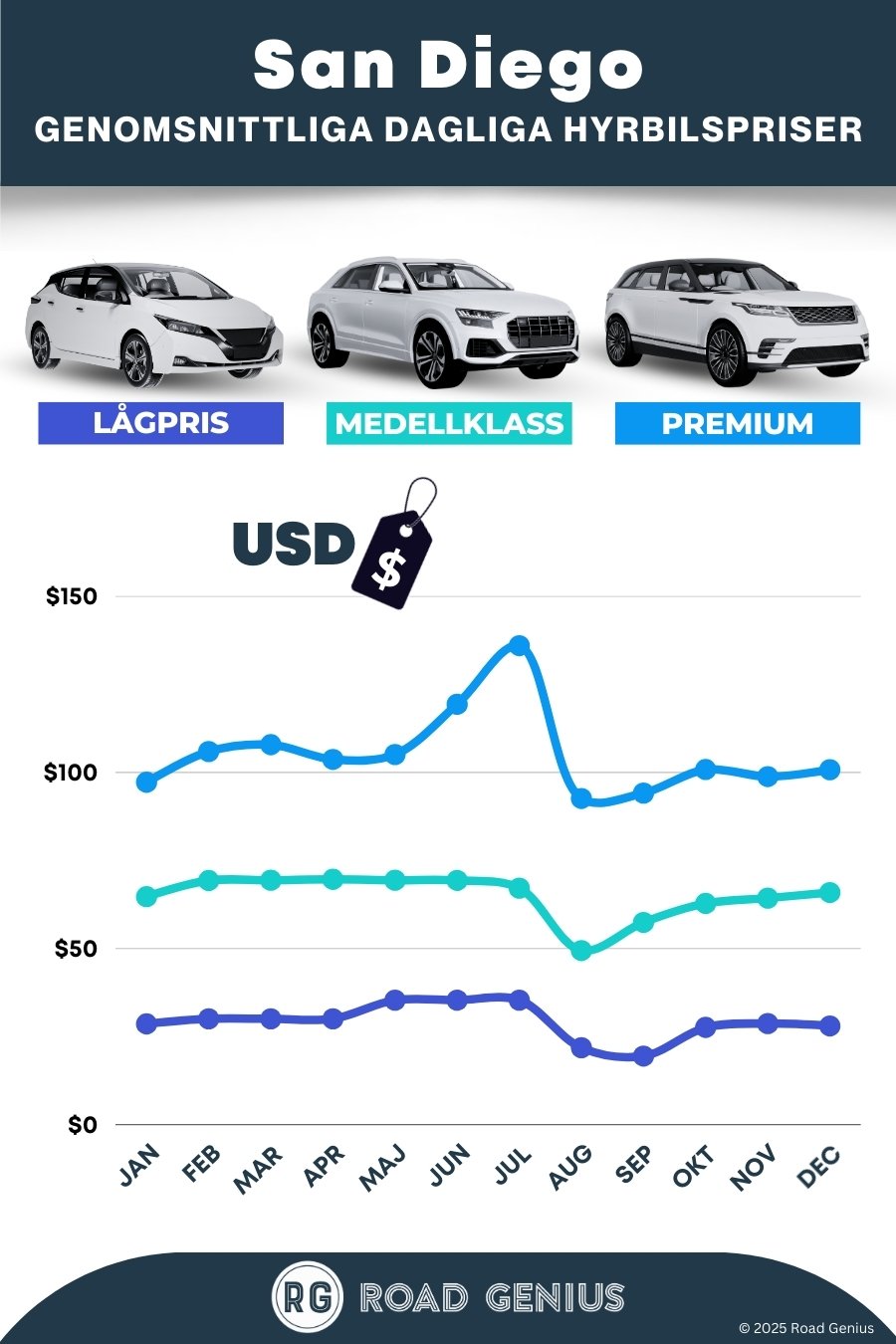 I genomsnitt kostar en bilhyra i San Diego cirka USD $66 per dag, med de billigaste alternativen från USD $19 per dag.