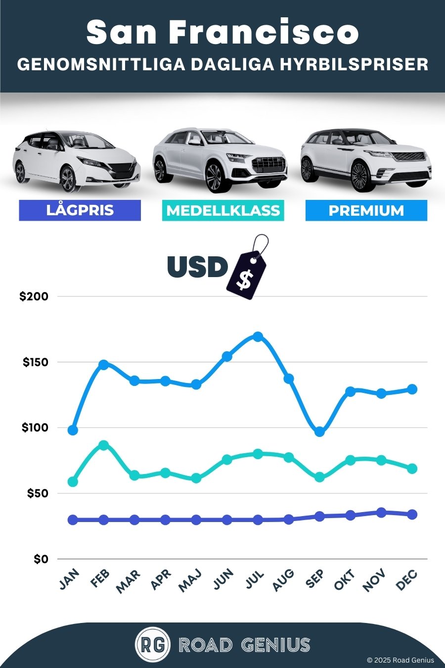 I genomsnitt kostar en bilhyra i San Francisco cirka USD $78 per dag, med de billigaste alternativen från USD $30 per dag.