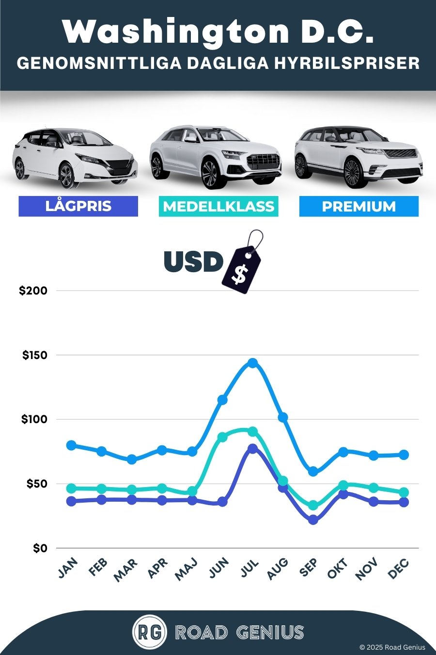 Jämför priser på hyrbilar från ledande uthyrare i Washington DC med Road Genius. Här hittar du allt från smidiga bilar i ekonomiklass till rymliga suvar och minibussar – alltid till bra priser och med upphämtning på en rad praktiska platser. Välj att hämta bilen på Reagan National (DCA), Dulles (IAD), Union Station eller i centrum. Jämför priser mellan olika upphämtningsplatser – kontor utanför flygplatserna har ofta lägre avgifter och kortare köer. Inför körsbärsblomningen på våren eller dagsutflykter till Shenandoah eller Annapolis, boka tidigt för att säkra bättre priser och större utbud.