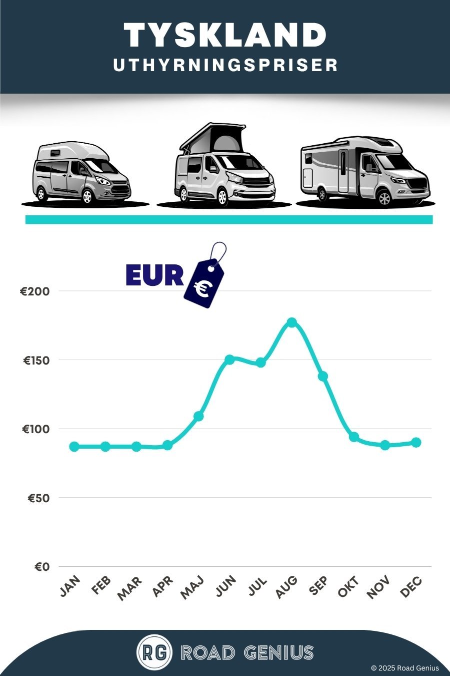 Road Genius hjälper dig att jämföra husbilsuthyrning i hela Tyskland och hitta rätt fordon och uthyrare för din resa. De största utlämningsplatserna finns i Berlin, Hamburg, Frankfurt och München. Från dessa städer tar du dig enkelt vidare till Bayern, Rhendalen eller den tyska Östersjökusten. Tack vare Tysklands täta nätverk av så kallade "Stellplätze" (ställplatser avsedda för husbilar) är det enkelt att stanna spontant nästan året runt.