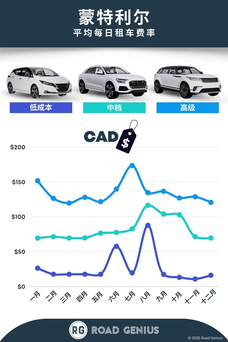 平均而言,蒙特利尔 的汽车租赁每日费用约为 CA$81,最低租金为每日 CA$11。