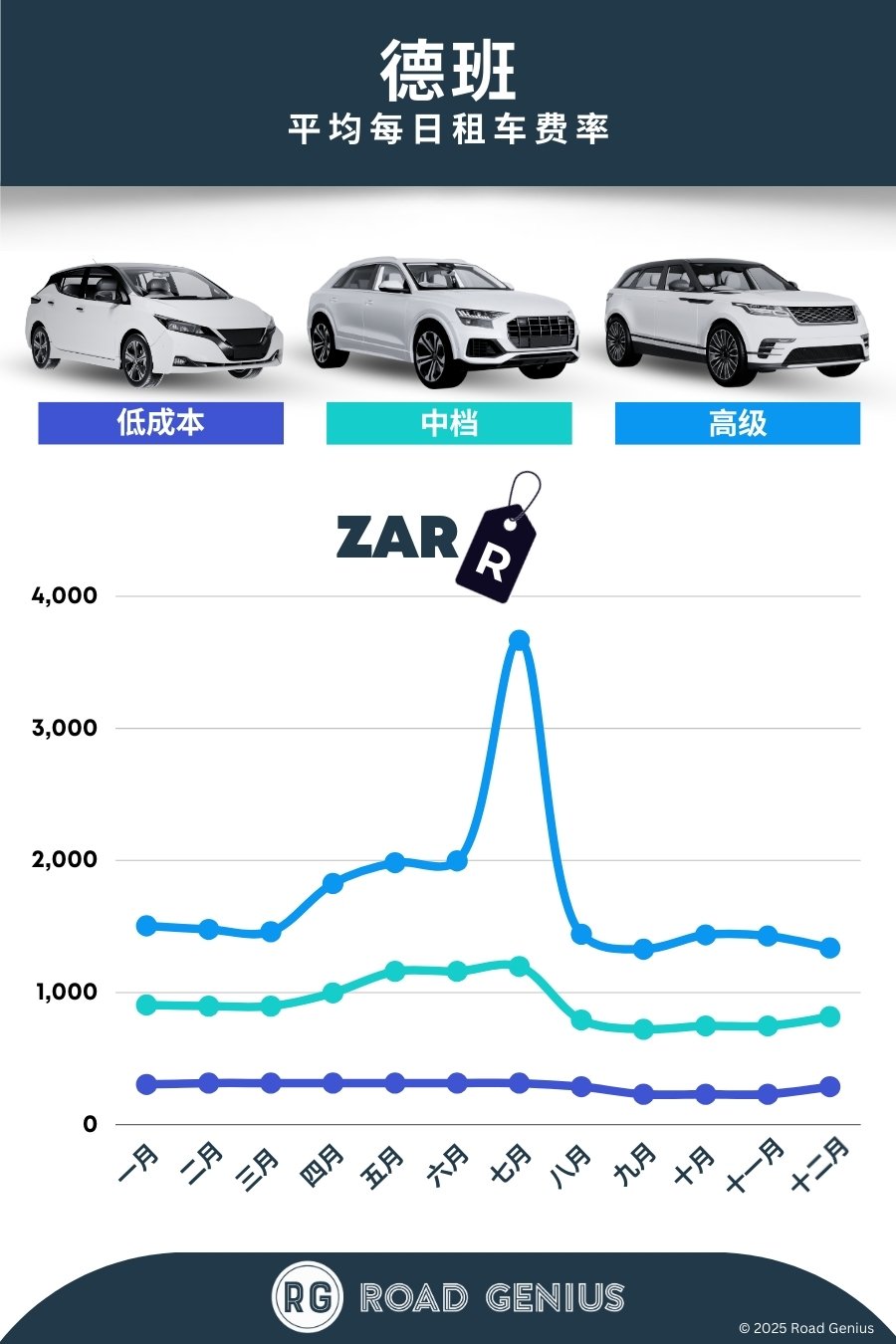 灵活选择租期:德班周三取车通常最便宜,8 月价格最低。若遇 12 月或复活节旺季,建议提前 3 至 6 个月预订。淡季可先观望,遇到优惠时再下单。