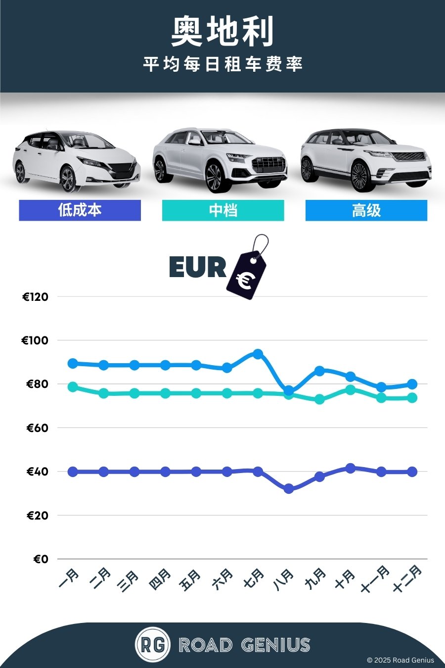 平均而言,奥地利 的汽车租赁每日费用约为 €67,最低租金为每日 €32。