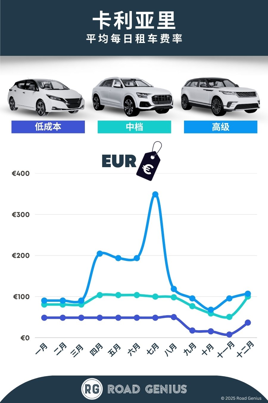 Road Genius 帮你轻松比价卡利亚里租车,一站式预订更省心。你可以在卡利亚里机场(CAG)、市中心或港口取车,根据自己的行程自驾畅游撒丁岛南部热门目的地,如 Villasimius、Chia、Nora 等。7 月至 8 月为旺季,建议尽早预订,并注意市中心的 ZTL(限行区)规定,避免罚款。