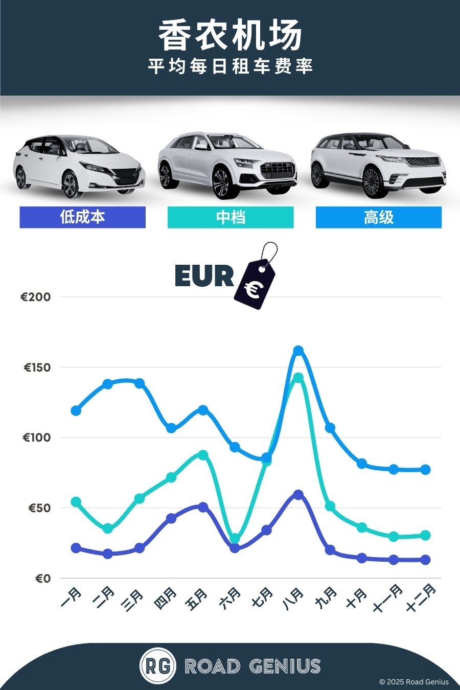 平均而言,香农机场 的汽车租赁每日费用约为 €65,最低租金为每日 €13。