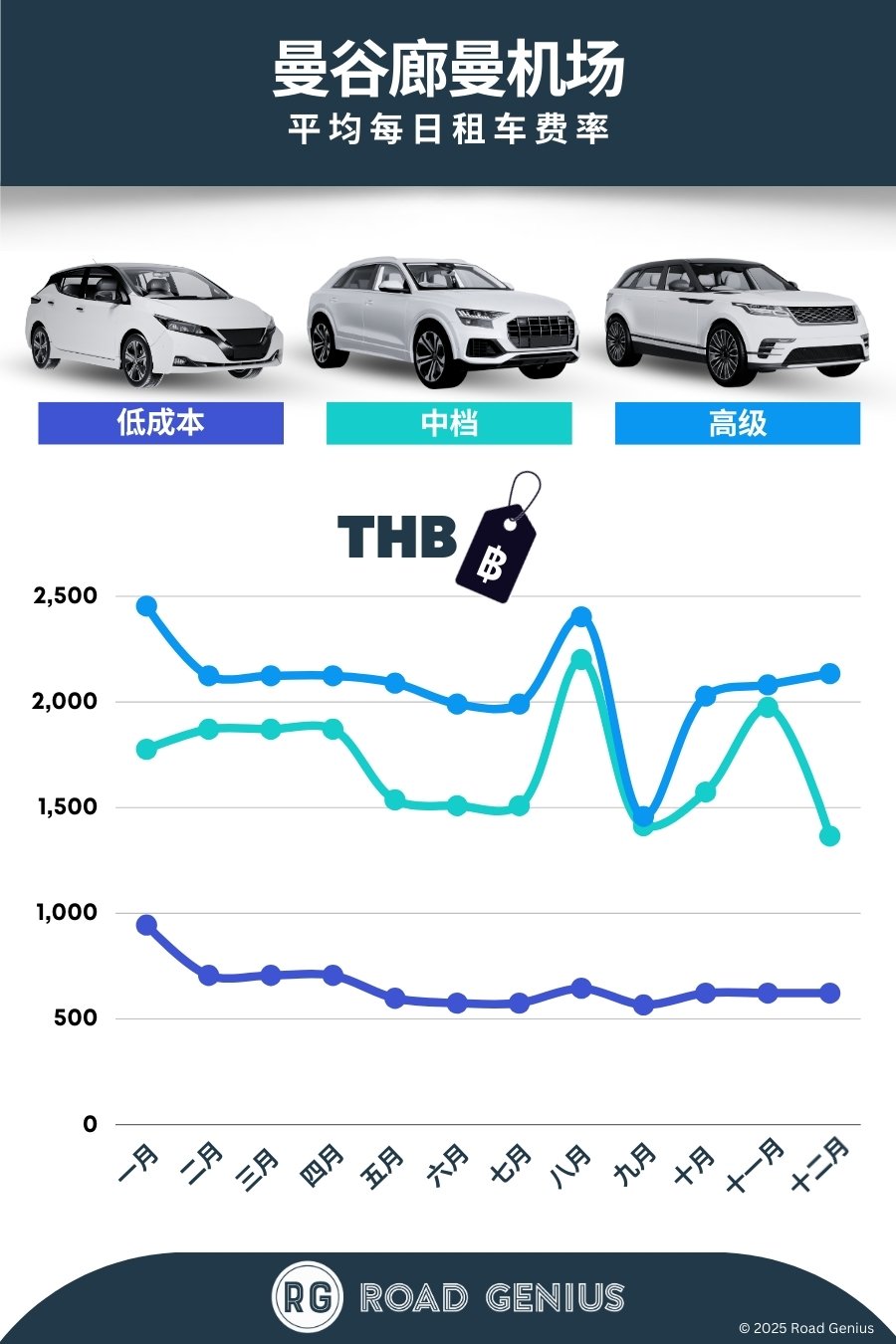 平均而言,曼谷廊曼机场 的汽车租赁每日费用约为 ฿1,482,最低租金为每日 ฿566。