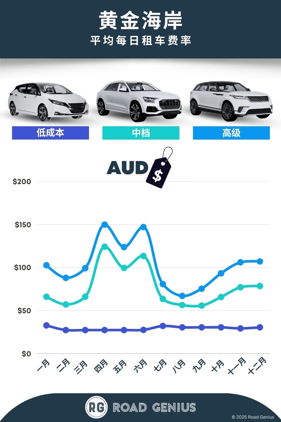 在黄金海岸租车的平均费用约为每天AUD $91,最低价格可低至每天AUD $27。