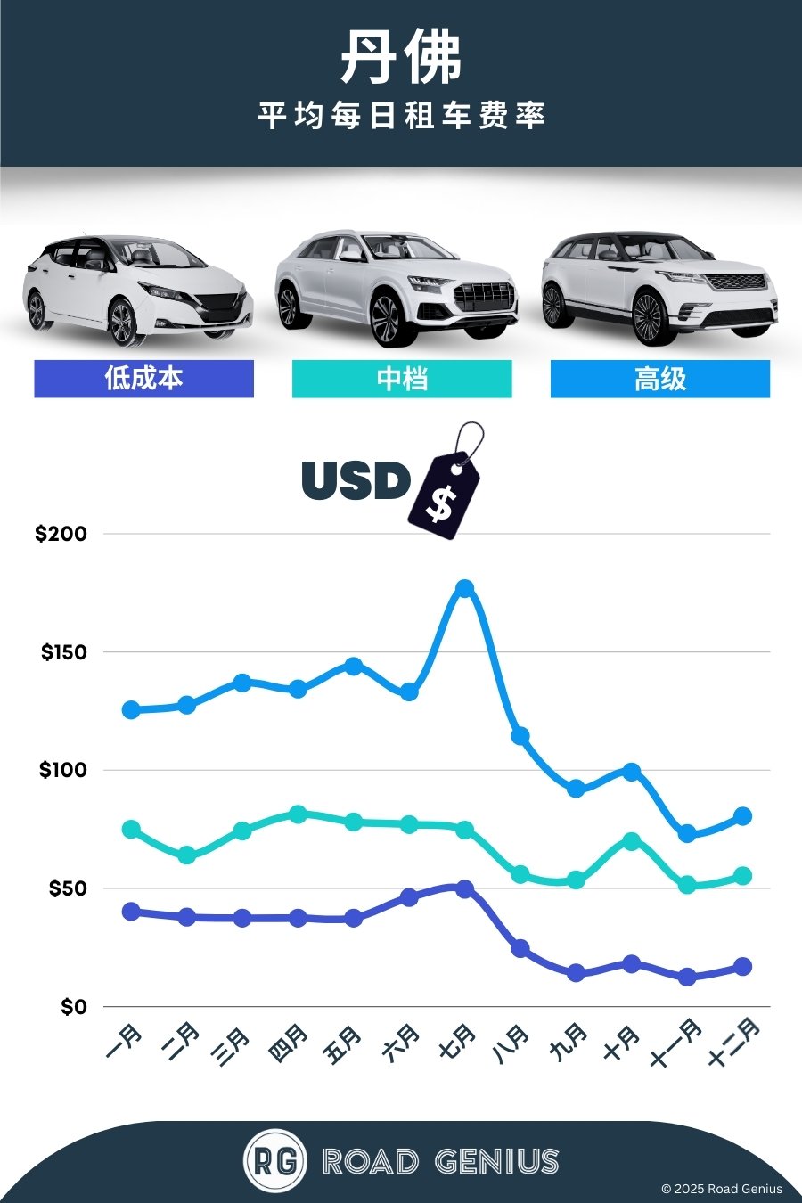 平均而言,丹佛 的汽车租赁每日费用约为 US$73,最低租金为每日 US$13。