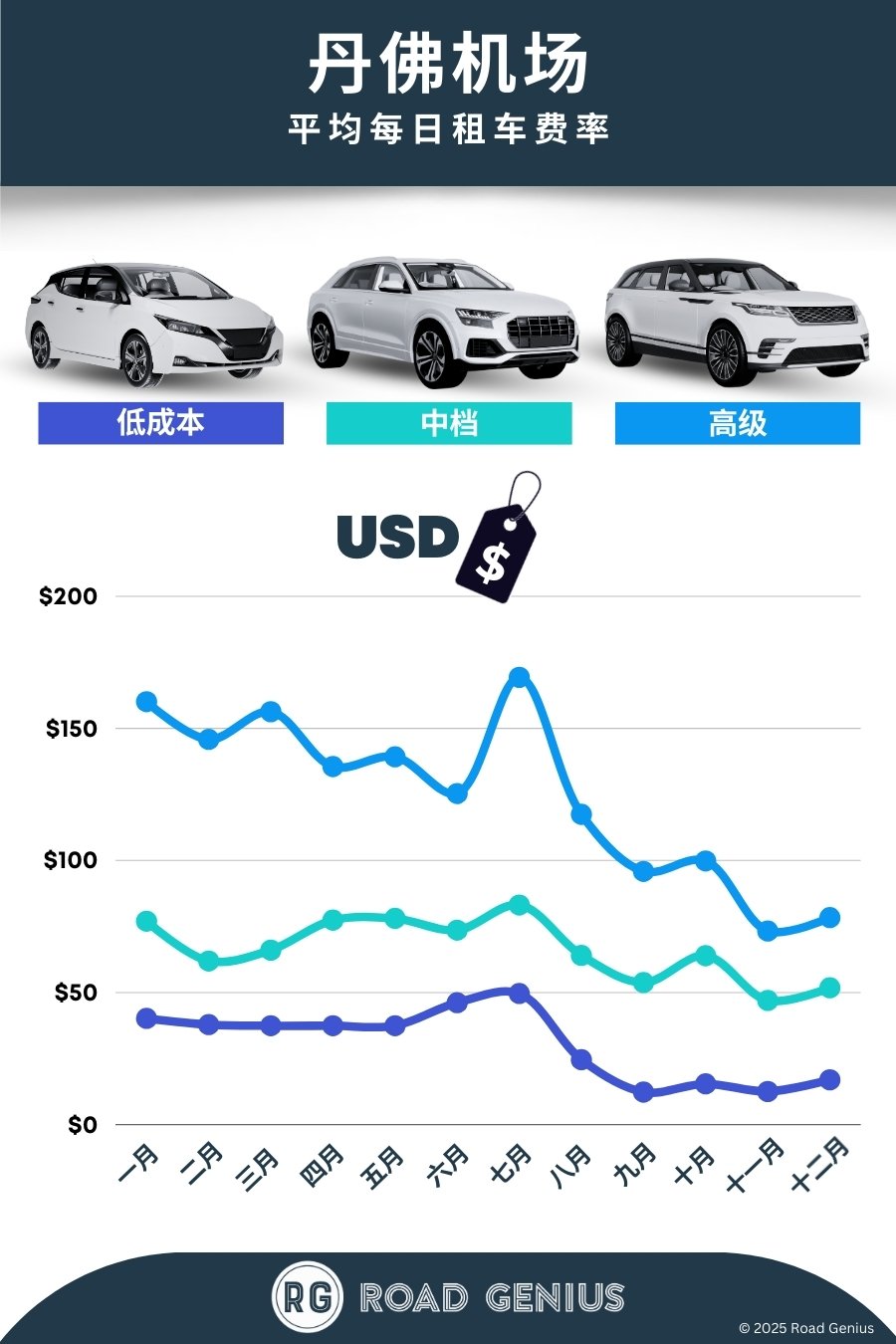 平均而言,丹佛机场 的汽车租赁每日费用约为 US$74,最低租金为每日 US$12。