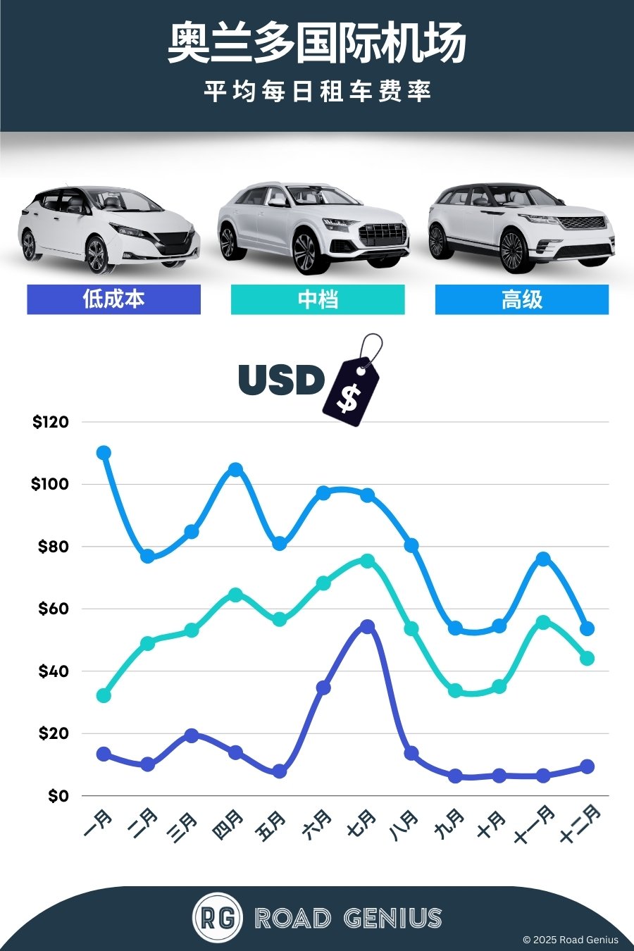 平均而言,奥兰多国际机场 的汽车租赁每日费用约为 US$50,最低租金为每日 US$6。