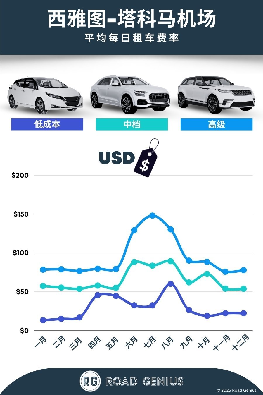 平均而言,西雅图-塔科马机场 的汽车租赁每日费用约为 US$63,最低租金为每日 US$13。