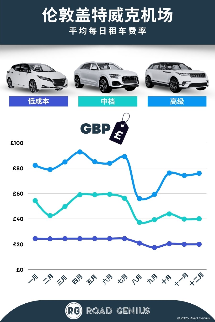 平均而言,伦敦盖特威克机场 的汽车租赁每日费用约为 €50,最低租金为每日 €17。