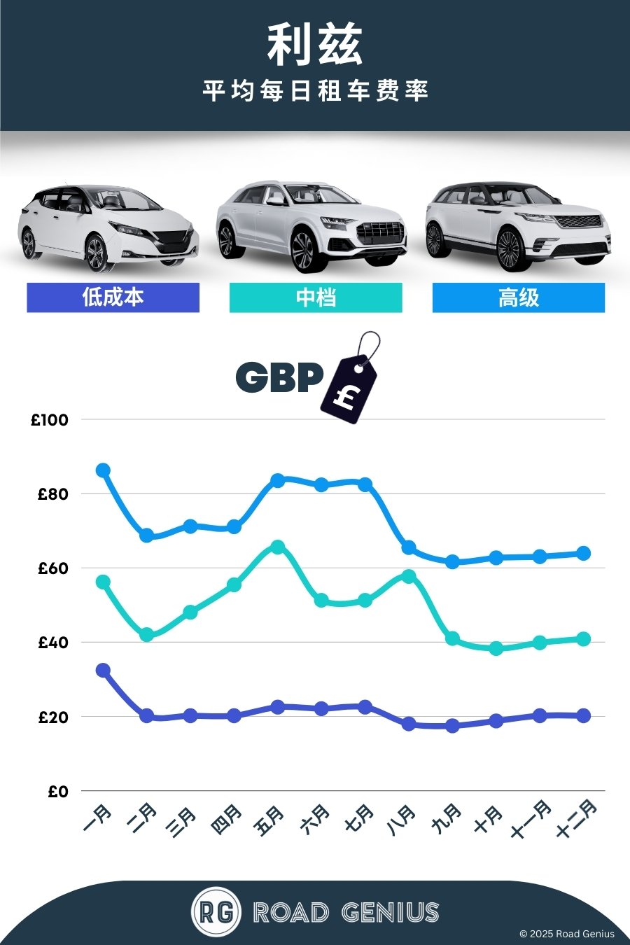 平均而言,利兹 的汽车租赁每日费用约为 €47,最低租金为每日 €17。