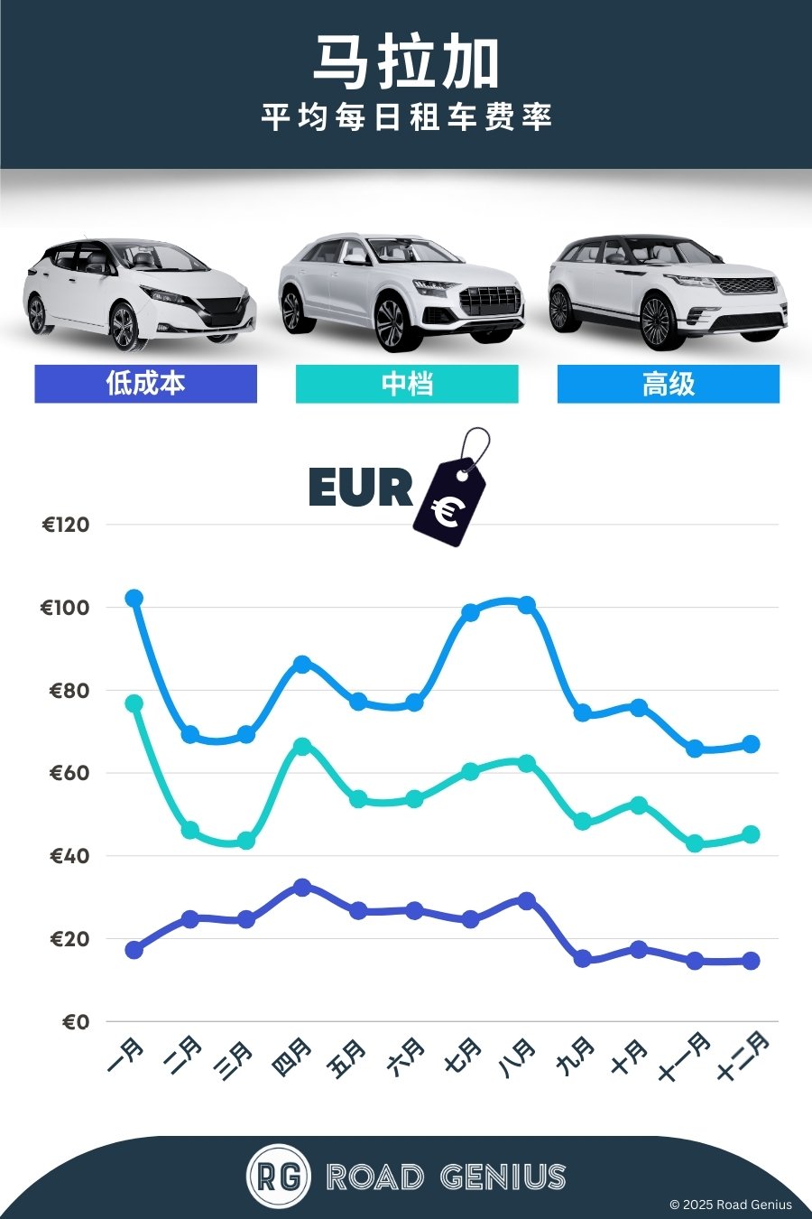 平均而言,马拉加 的汽车租赁每日费用约为 €52,最低租金为每日 €15。