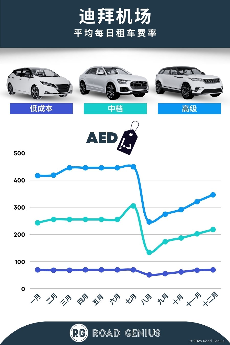 平均而言,迪拜机场 的汽车租赁每日费用约为 224 AED,最低租金为每日 51 AED。