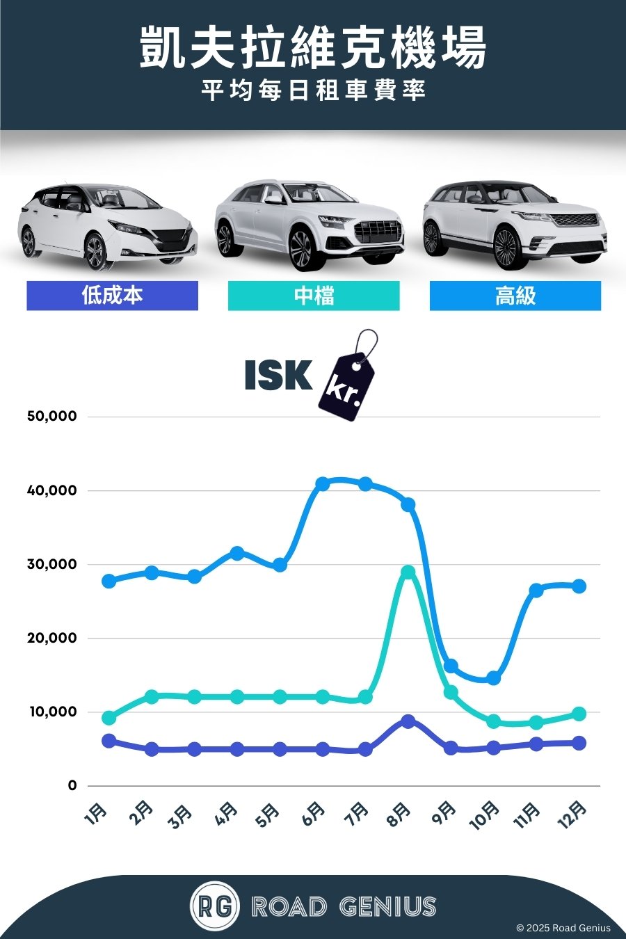 平均而言,凱夫拉維克機場 的租車費用約為每日 15,750 ISK,最低價格為每日 4,973 ISK。