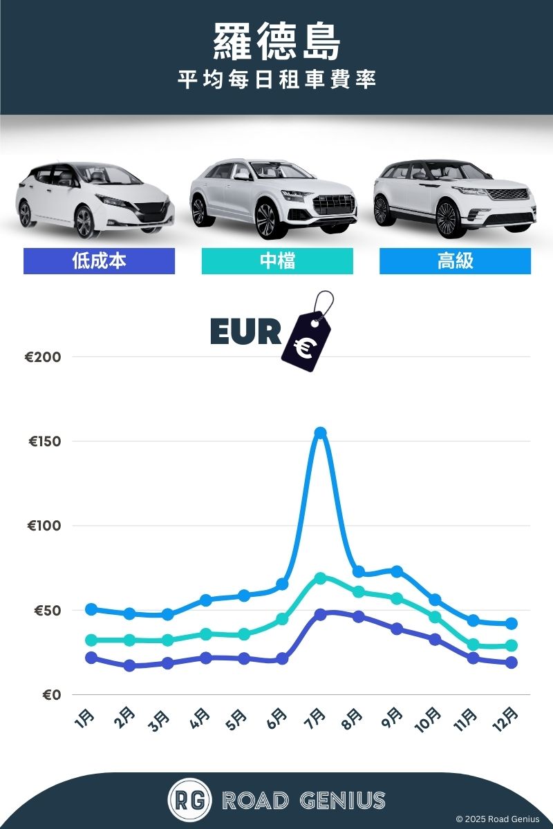 平均而言,羅德島 的租車費用約為每日 €44,最低價格為每日 €17。