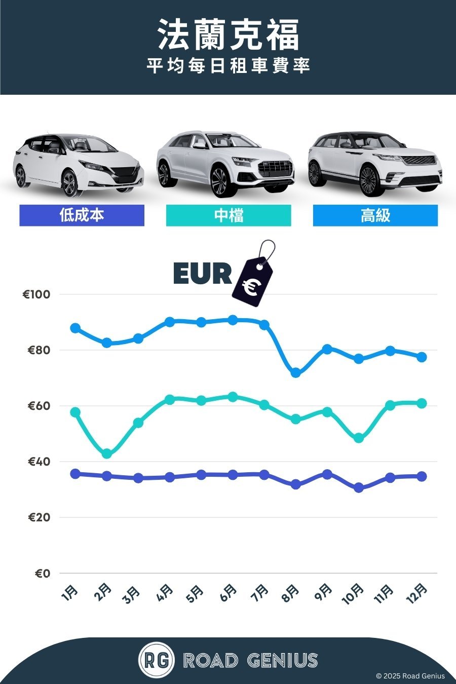 平均而言,法蘭克福 的租車費用約為每日 €58,最低價格為每日 €31。