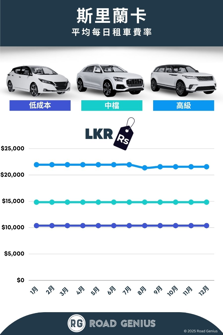 在 Road Genius 比較斯里蘭卡的租車價格。即時查看 SUV、小型掀背車、廂型車等多種級距的費率,預訂不收手續費。你可以在科倫坡班達拉奈克國際機場(CMB)、科倫坡市區與尼甘布,比較各大國際與在地租車公司。多數車款提供無限里程、自排變速箱及非營業時間取車等選項。下訂前,請務必確認斯里蘭卡的駕照規定(是否需要國際駕駛許可證(HK:國際駕照)或申請當地臨時許可),並留意當地「靠左行駛」的交通規則與高速公路收費制度。