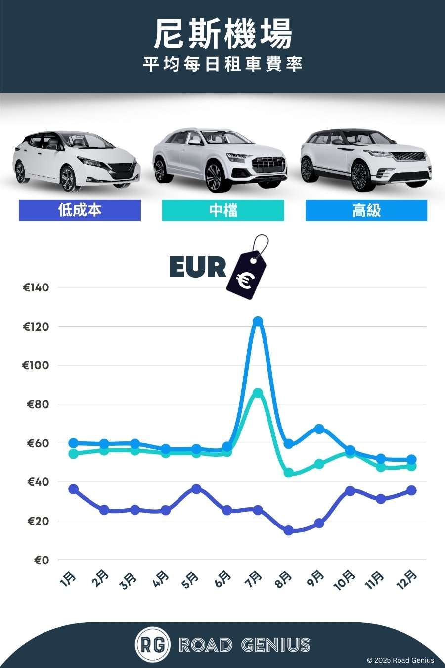 平均而言,尼斯機場 的租車費用約為每日 €49,最低價格為每日 €15