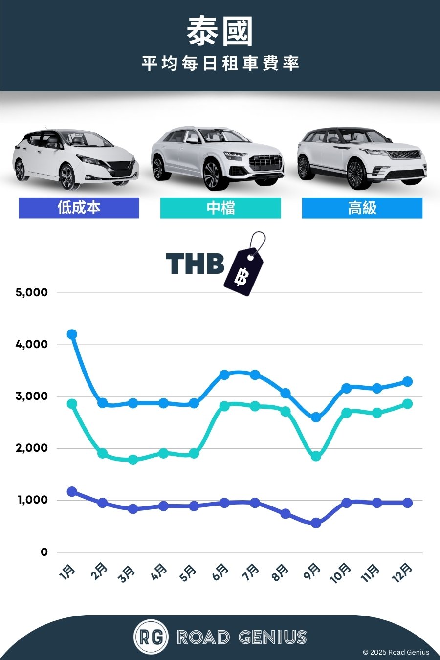 平均而言,泰國 的租車費用約為每日 THB ฿2,150,最低價格為每日 THB ฿566。
