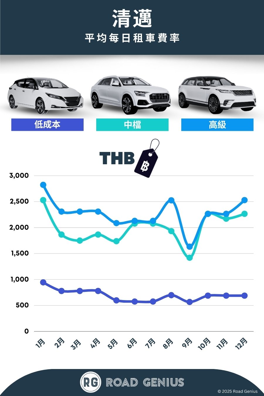 使用 Road Genius 即時比較清邁的租車價格,搜尋範圍涵蓋 SUV、小型車到廂型車(MPV)等多種車款,線上預訂免手續費。無論在清邁國際機場或市區據點(古城、寧曼區)都能便利取還車,方便你自駕前往素帖山、因他農山、拜縣或清萊等熱門景點。每年 11 月至隔年 2 月是旅遊旺季,建議提早預訂,以鎖定優惠價格及所需車款。