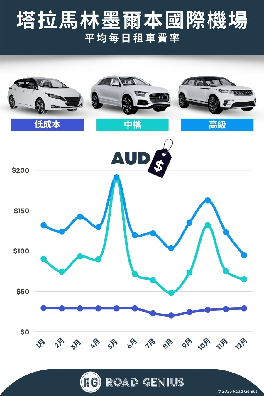 平均而言,在 墨爾本機場 (MEL) 租車的費用約為每天 AUD $111,最低價格則低至每天 AUD $20。