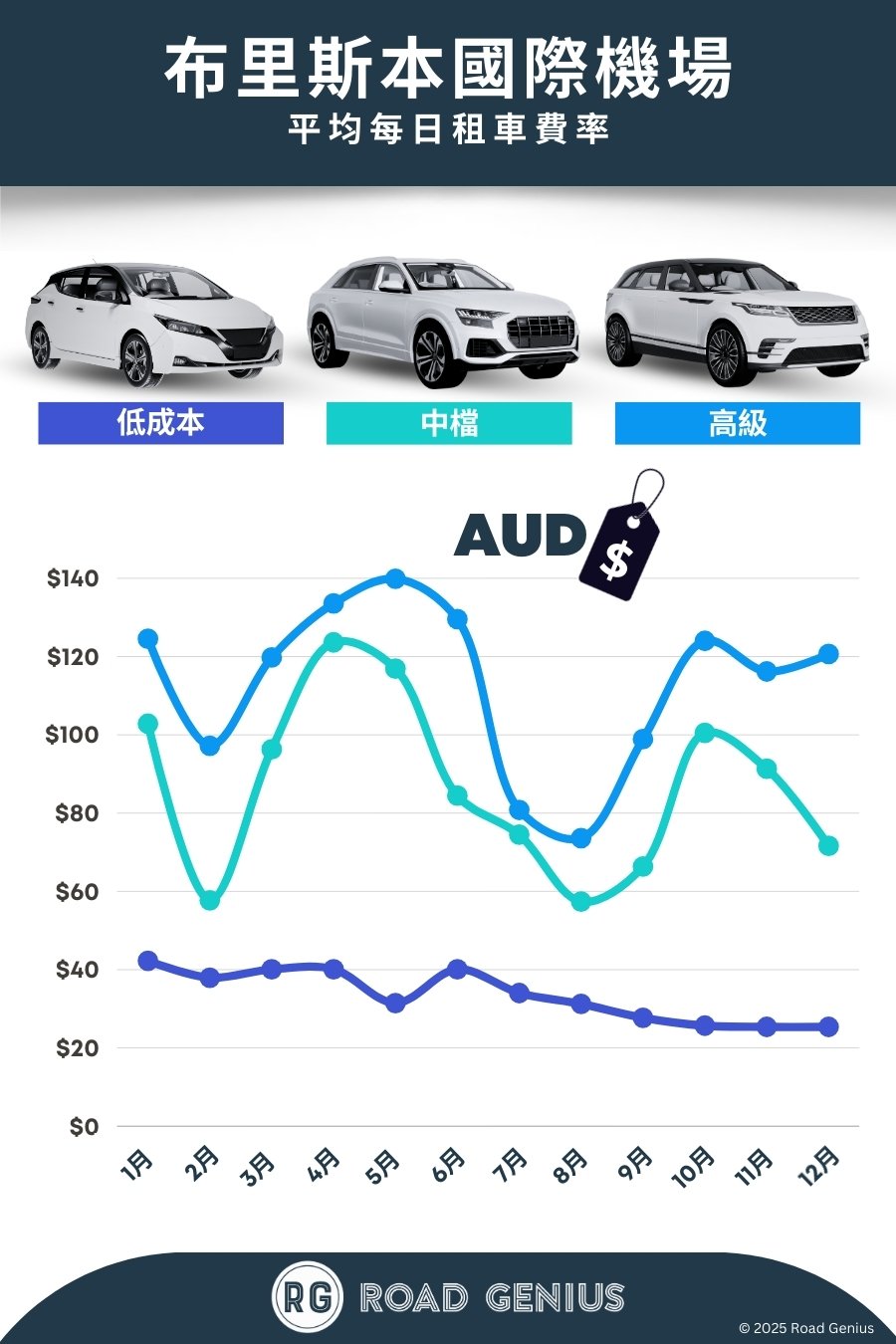 平均而言,在 布里斯本機場 (BNE) 租車的費用約為每天 AUD $103,最低租金則低至每天 AUD $25。