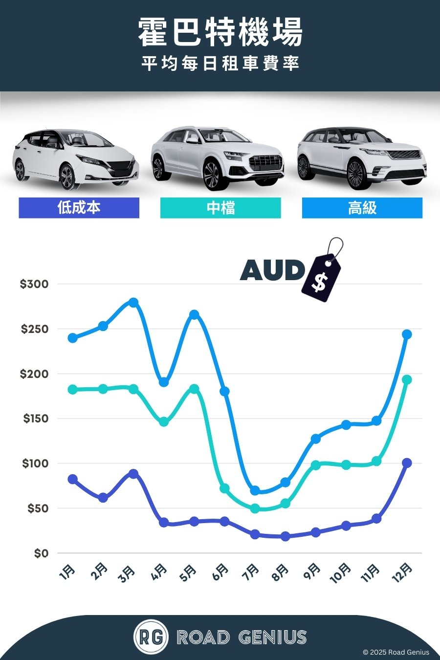 在 荷伯特機場 (HBA) 的平均租車費用約為每天 AUD $160,最低價格則從每天 AUD $19 起。