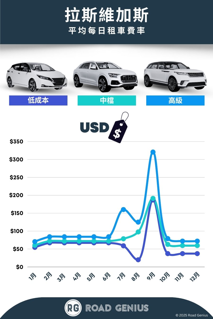彈性調整租車日期:平日(週日至週四)的租金通常比週末便宜。CES 消費電子展、春假與國定假日等尖峰期間,請務必提早預訂。每年 12 月上旬、1 月下旬及 10 月中旬是相對的淡季,較有機會找到優惠。