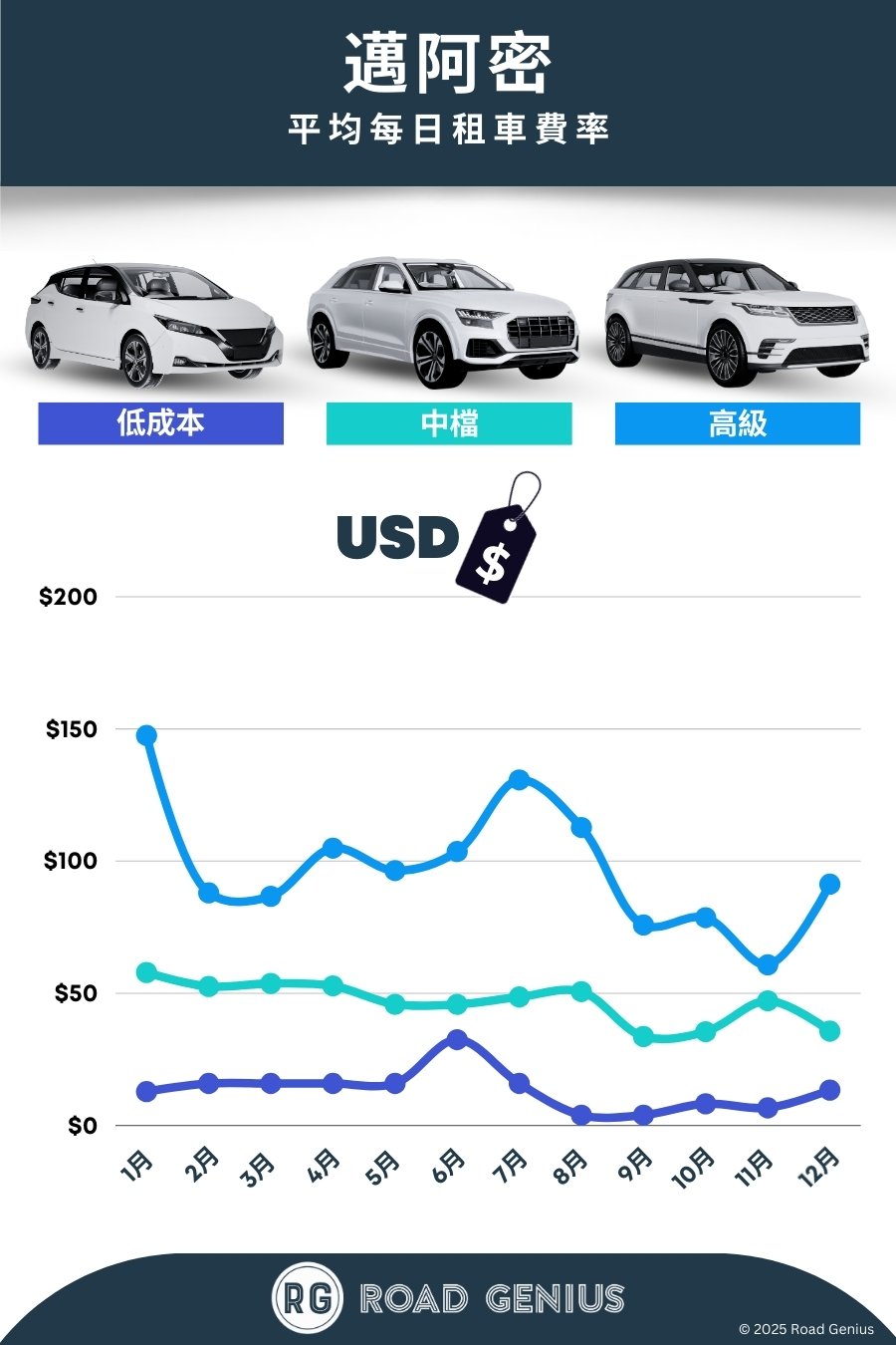 平均而言,邁阿密 的租車費用約為每日 USD $53,最低價格為每日 USD $4