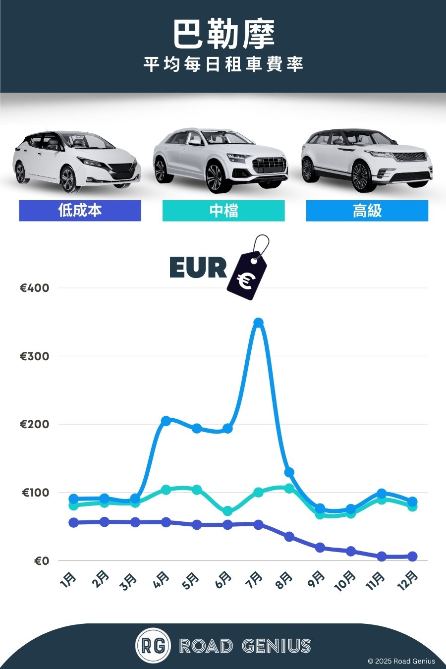 平均而言,巴勒莫 的租車費용約為每日 €88,最低價格為每日 €6。