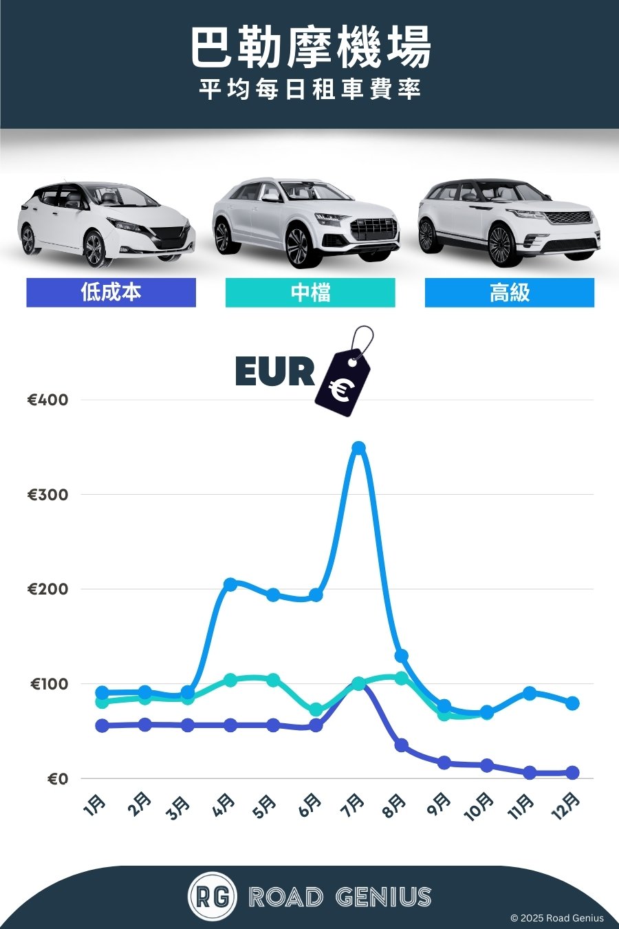 平均而言,巴勒莫機場 的租車費용約為每日 €89,最低價格為每日 €6。