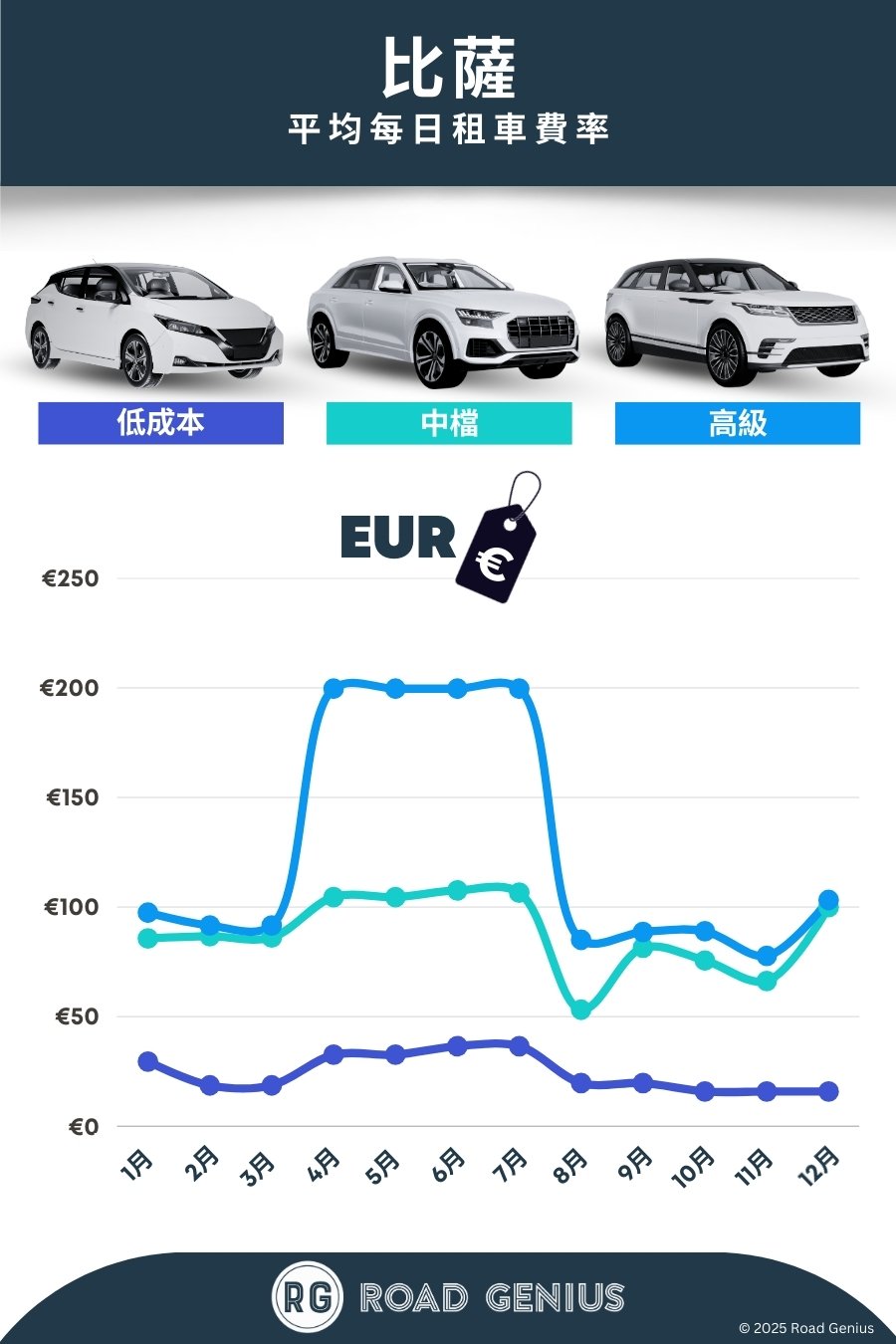 平均而言,比薩 的租車費用約為每日 €80,最低價格為每日 €16。