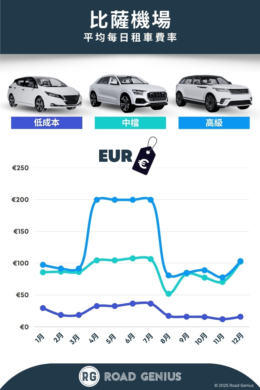 平均而言,比薩機場 的租車費용約為每日 €80,最低價格為每日 €12。