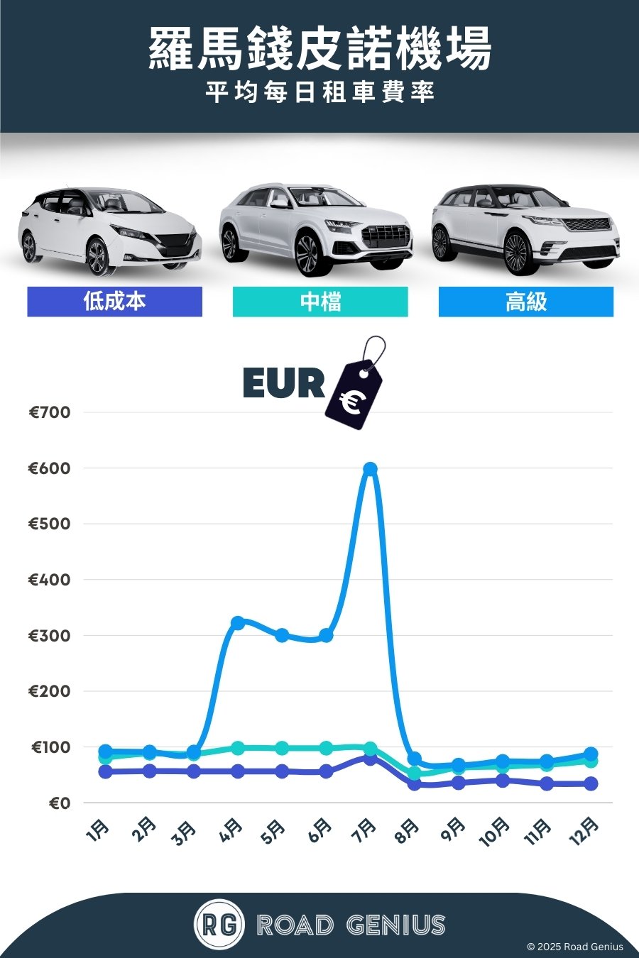 平均而言,羅馬錢皮諾機場 的租車費用約為每日 €104,最低價格為每日 €34。