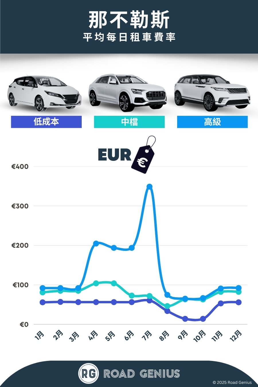 平均而言,那不勒斯 的租車費용約為每日 €86,最低價格為每日 €14。