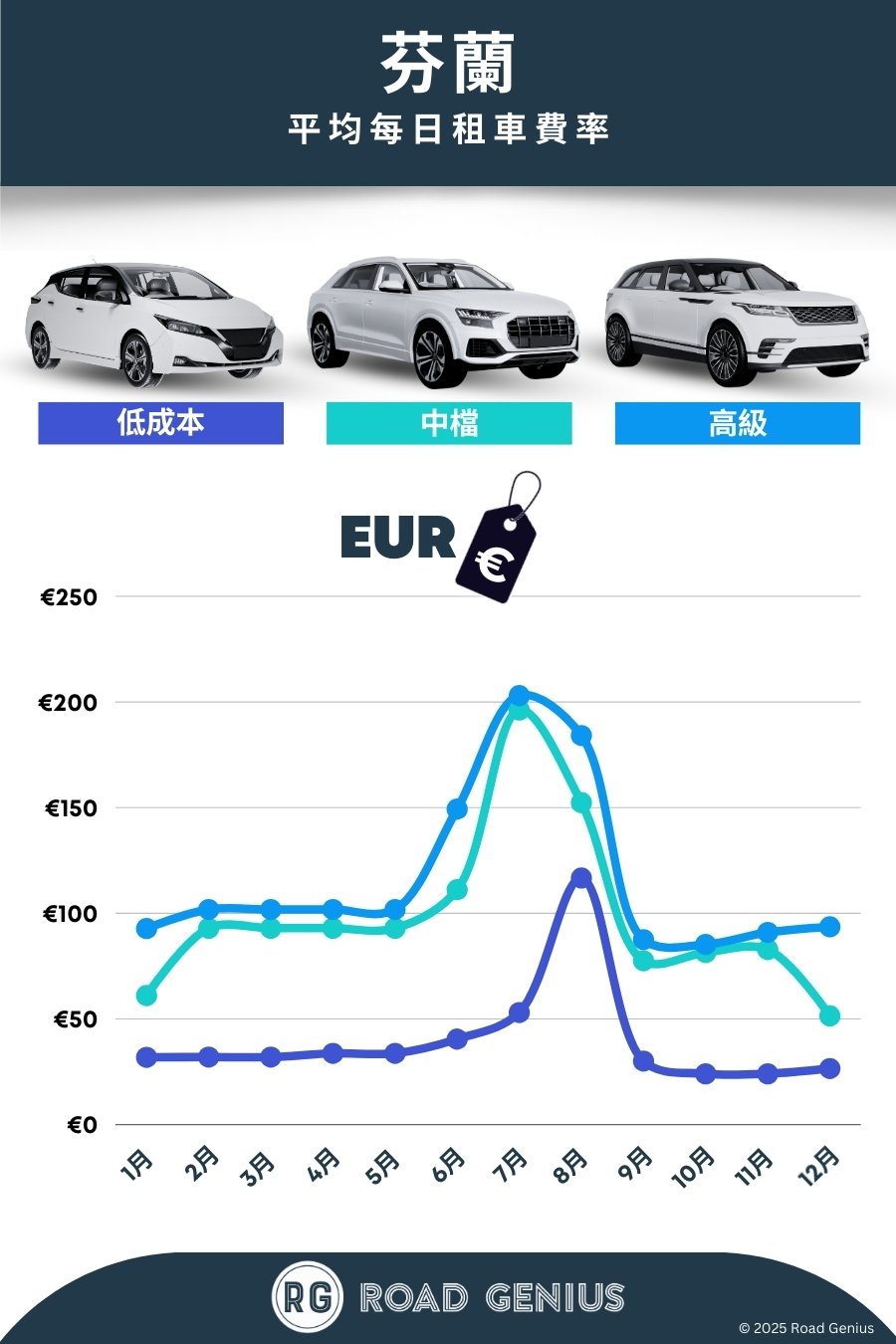 平均而言,芬蘭 的租車費用約為每日 €85,最低價格為每日 €24。