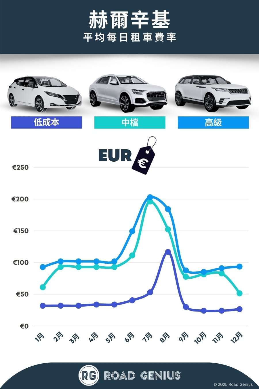 平均而言,赫爾辛基 的租車費用約為每日 €85,最低價格為每日 €24。