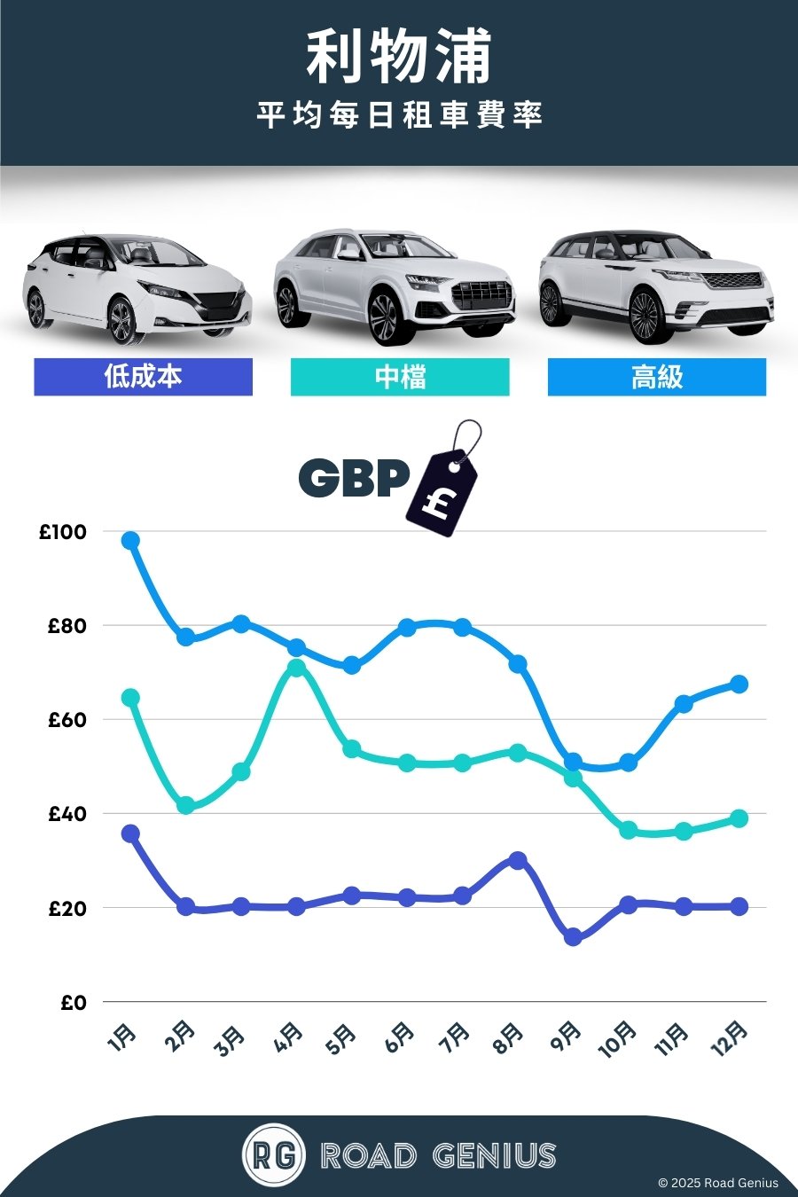 留意旅遊旺季: 6 月至 8 月、英超足球聯賽主場週末,以及英國國家障礙賽馬(Grand National)期間,租車價格通常會大幅上漲。彈性調整取還車日期,即使只錯開一天,也可能避開價格高峰。