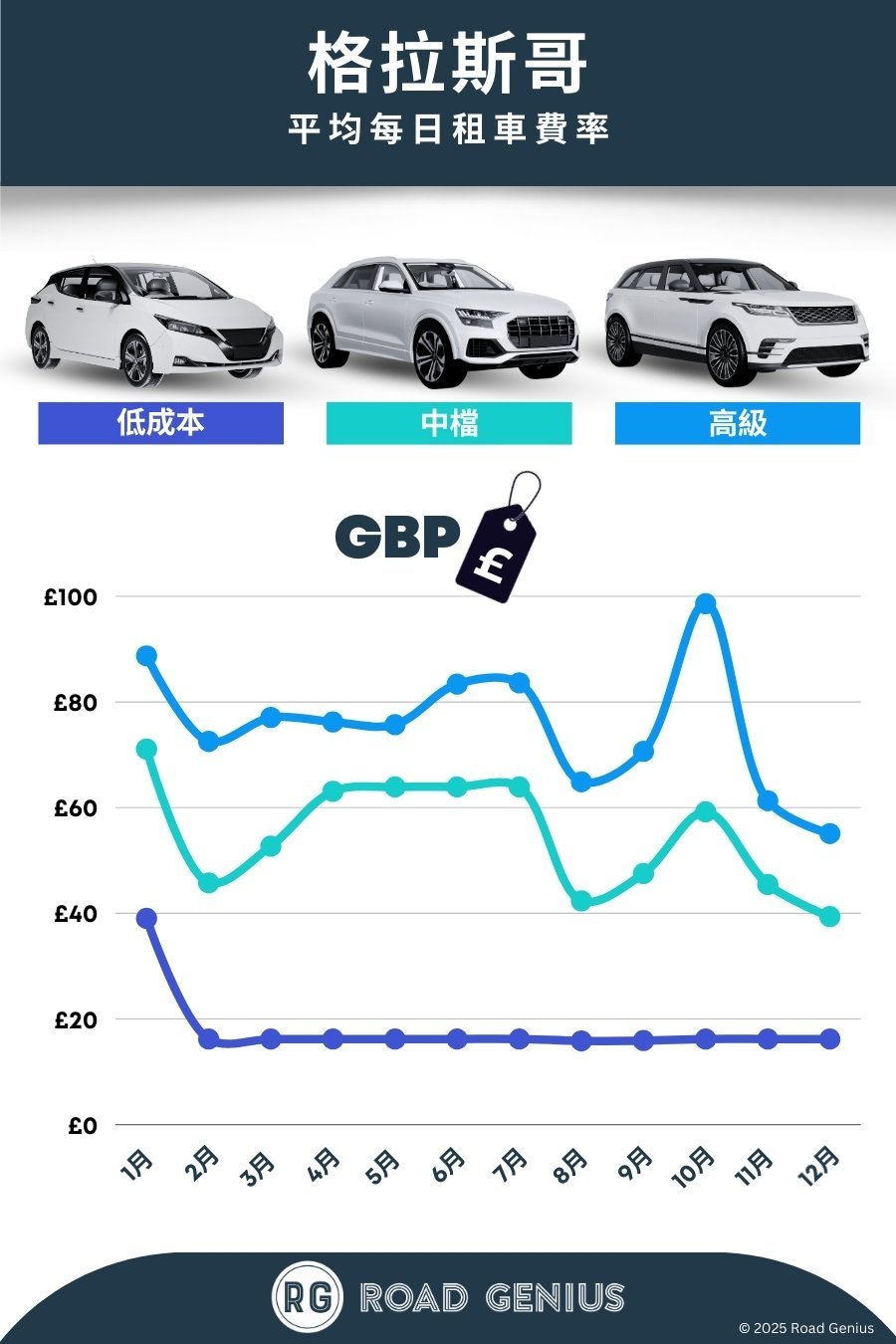 比較取車地點:機場據點的租金通常包含附加費。格拉斯哥市中心或近郊的營業所常便宜 10–15%。建議將前往租車點的計程車或火車費用一併納入預算考量。