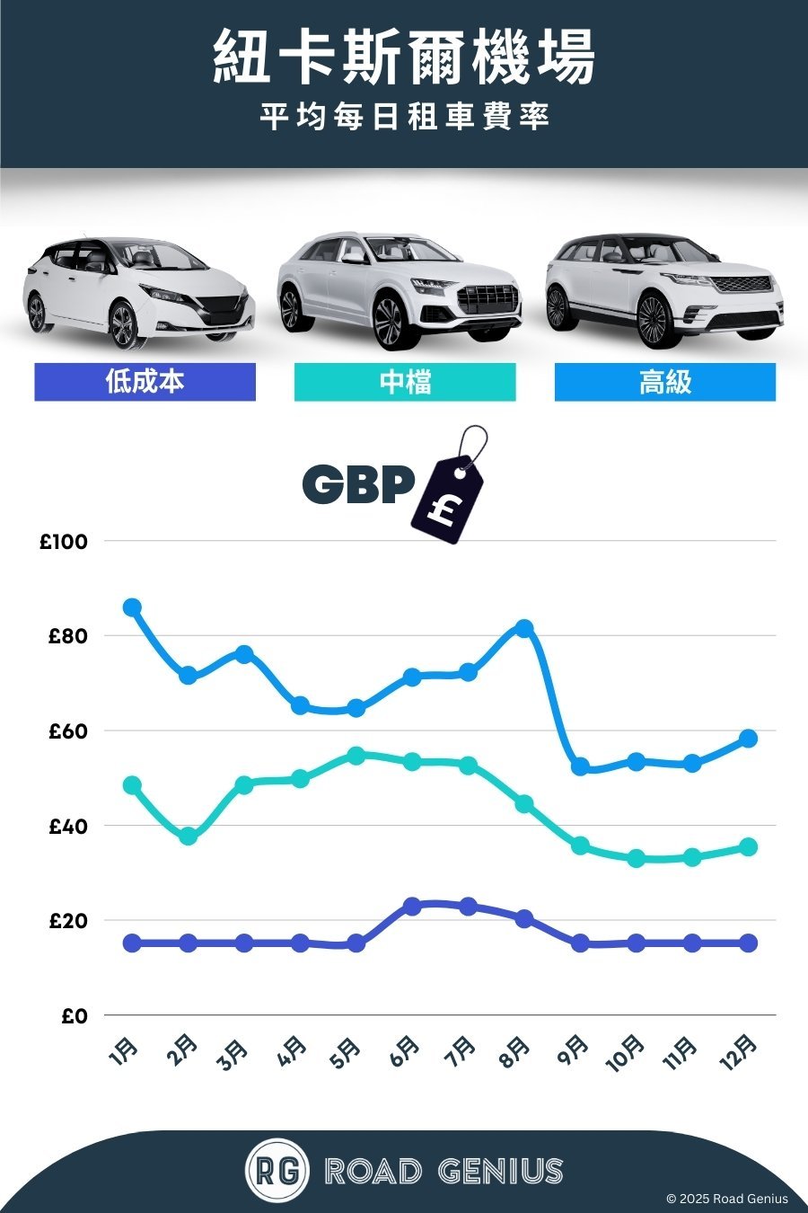 平均而言,紐卡斯爾機場 的租車費用約為每日 €55,最低價格為每日 €12。