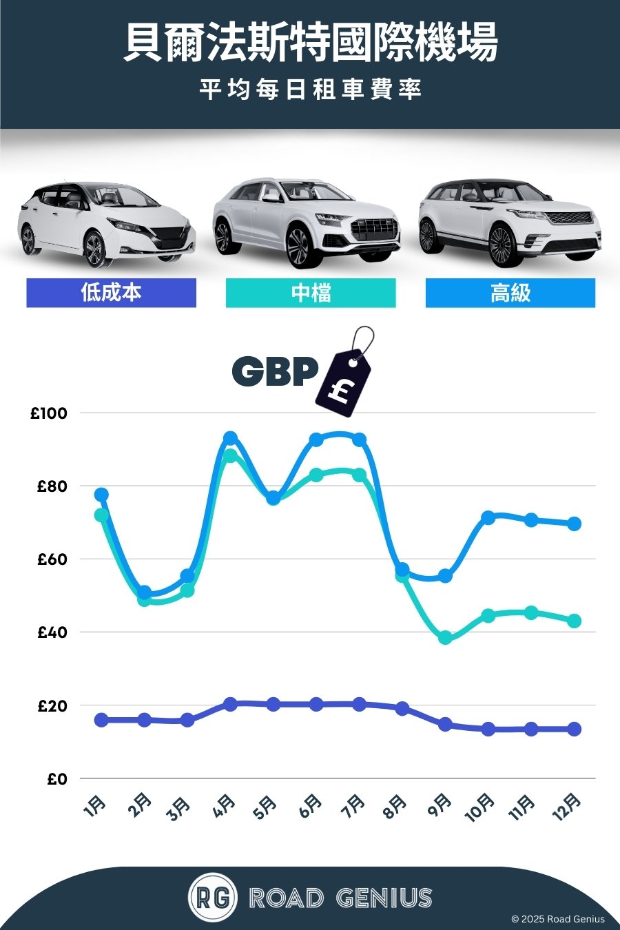 • 比較不同品牌、車款級距和取車日期。貝爾法斯特機場(BFS)通常在週一人潮最多,建議可同時比較週末或週間其他日期的價格。